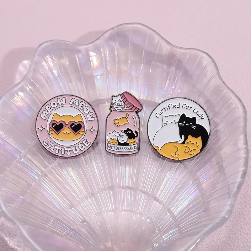 Round Animal Metal Enamel Pin Brooch Cute Kitten Wearing Glasses Creative Metal Badge Clothing Accessories