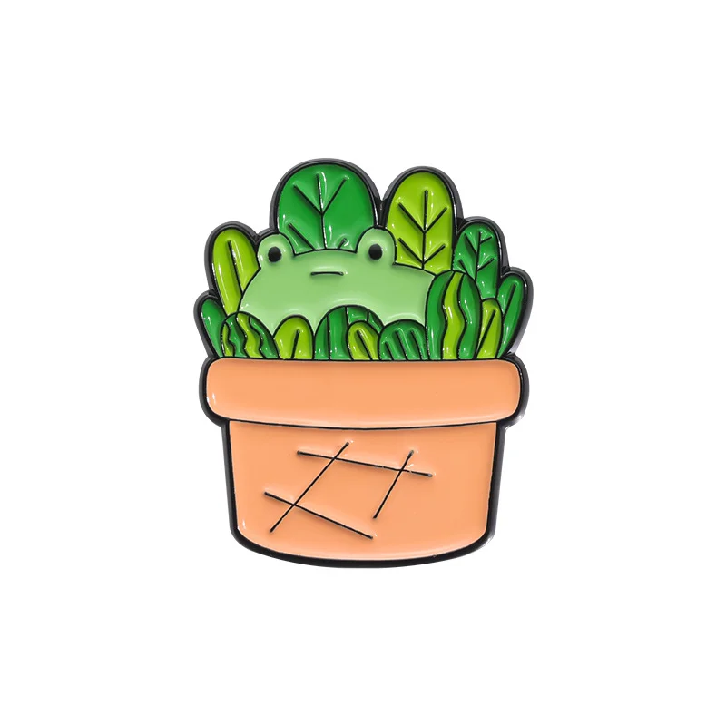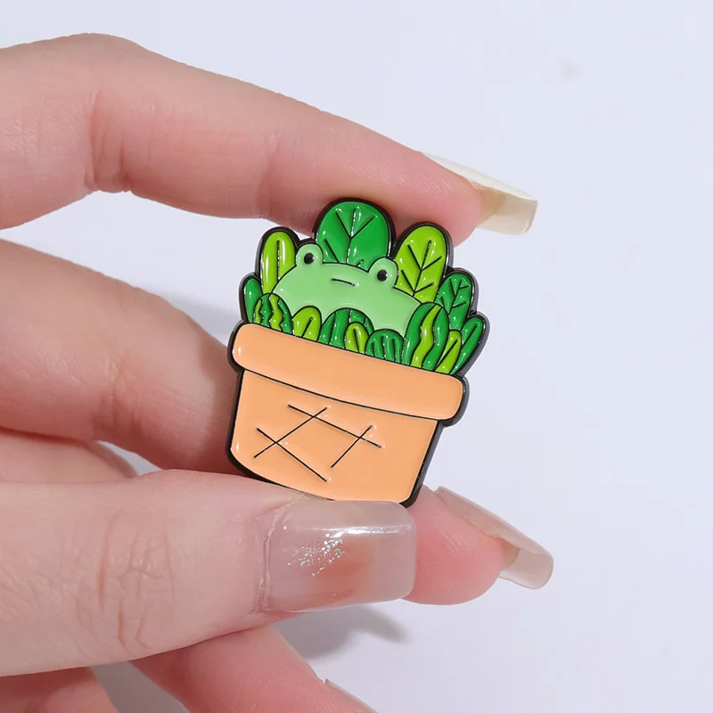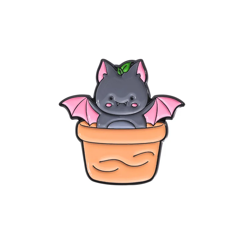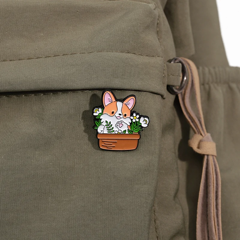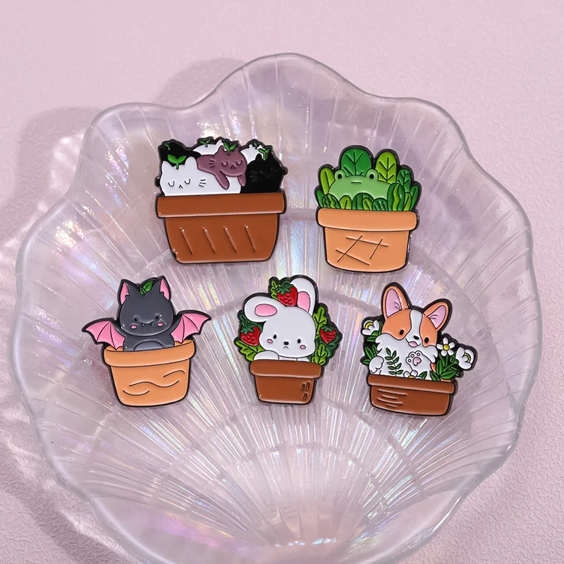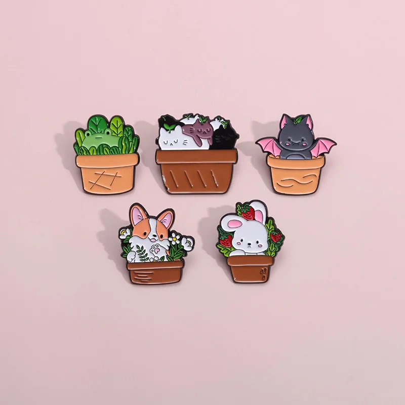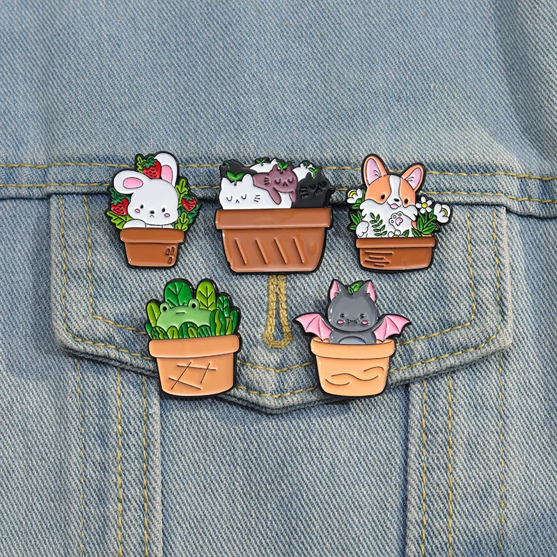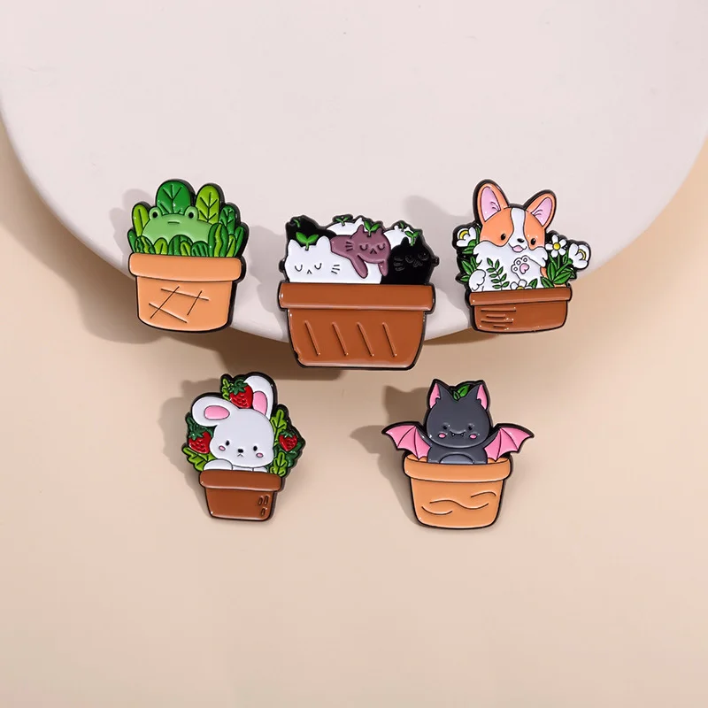Cute Small Animal Green Potted Metal Enamel Pin Brooch Badge Cat Dog Corgi Rabbit Frog Bat Exquisite Gift Corsage