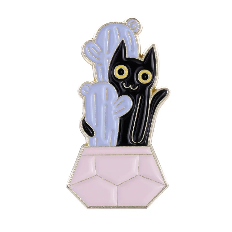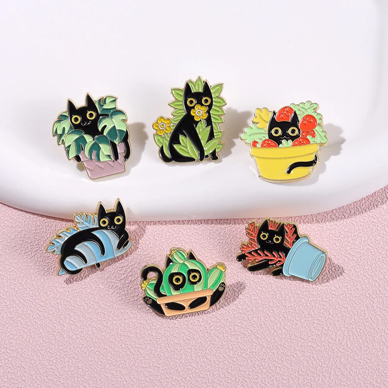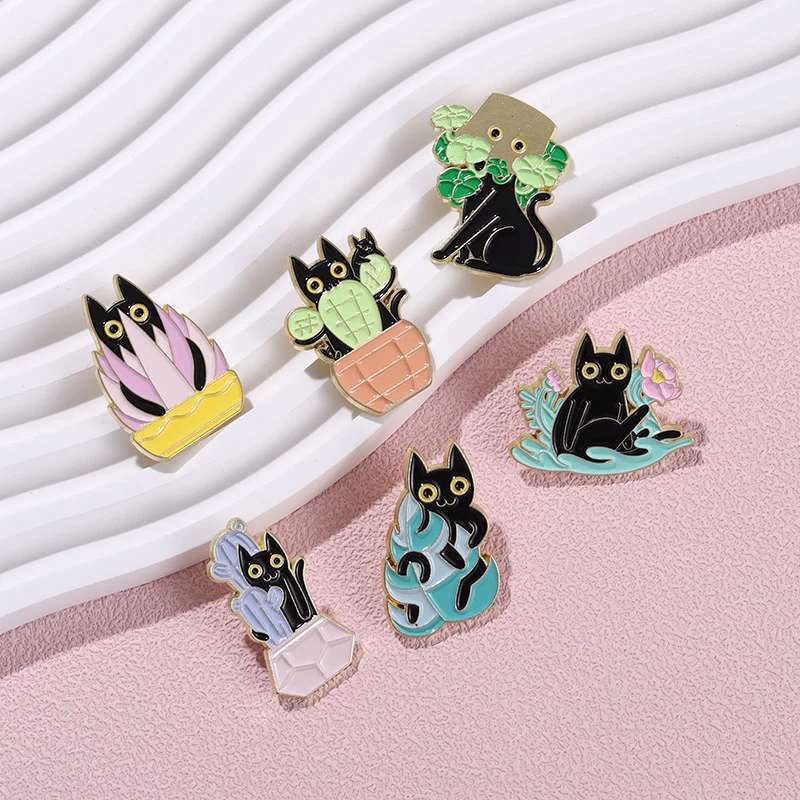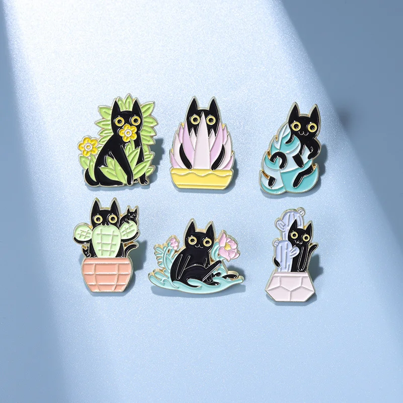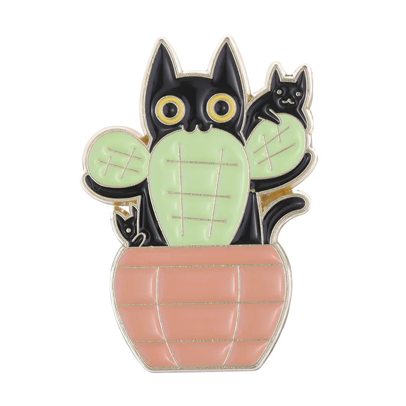 Cute Black Cat Potted Cactus Leaves Flower Enamel Brooch Brooch Plant Metal Badge Collar Pin Brooch Wholesale