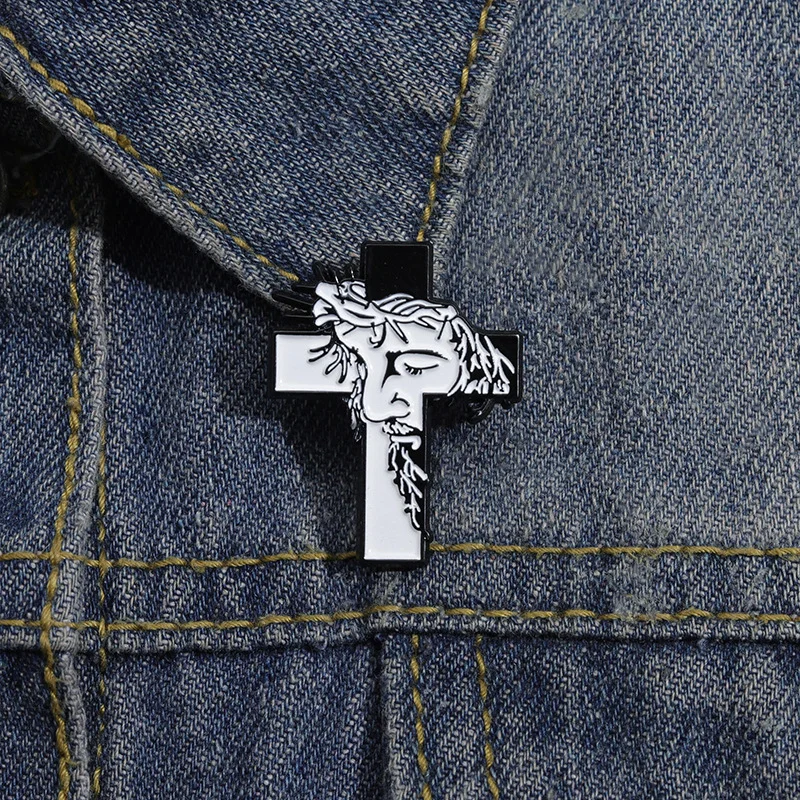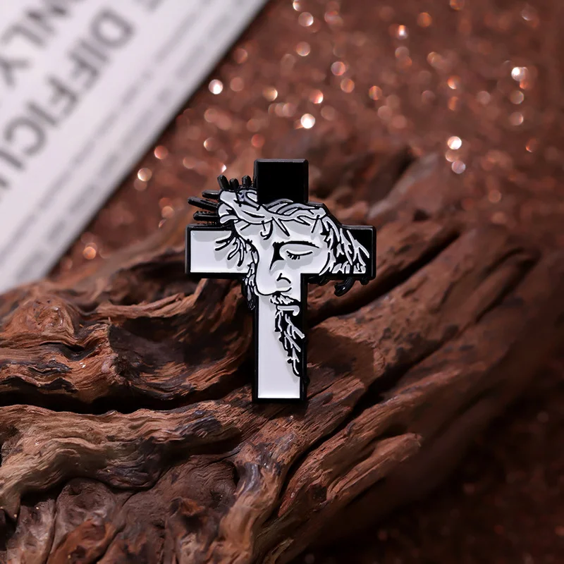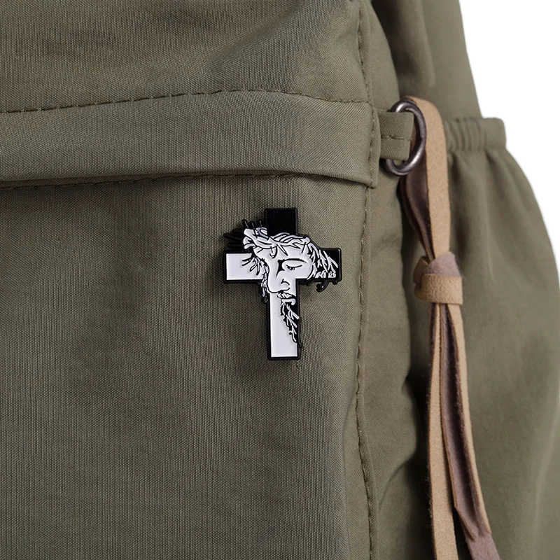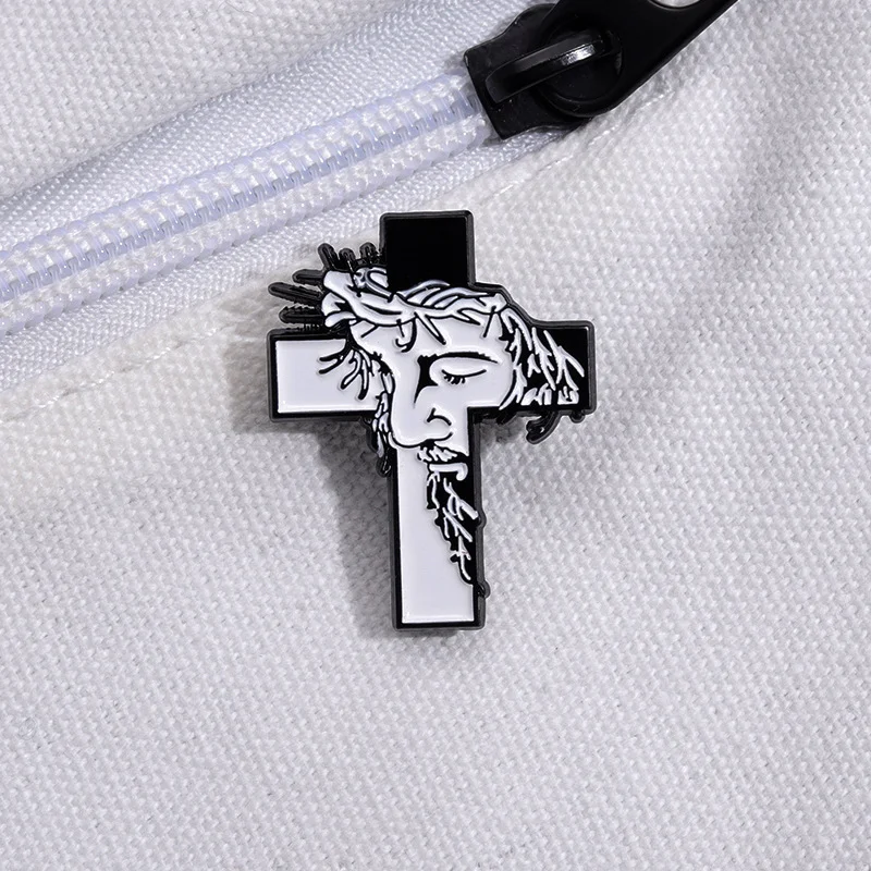 Cross Portrait Enamel Pin Jesus Brooch Fun Black and White Badge Cartoon Punk Jewelry Clothing Bag Accessories