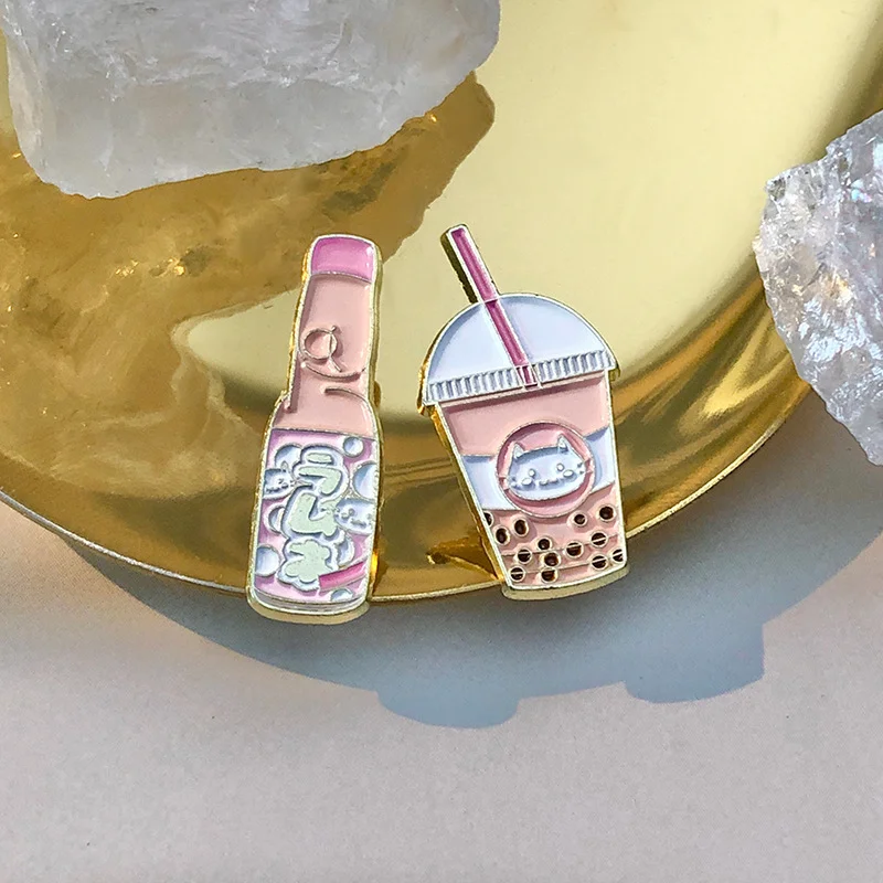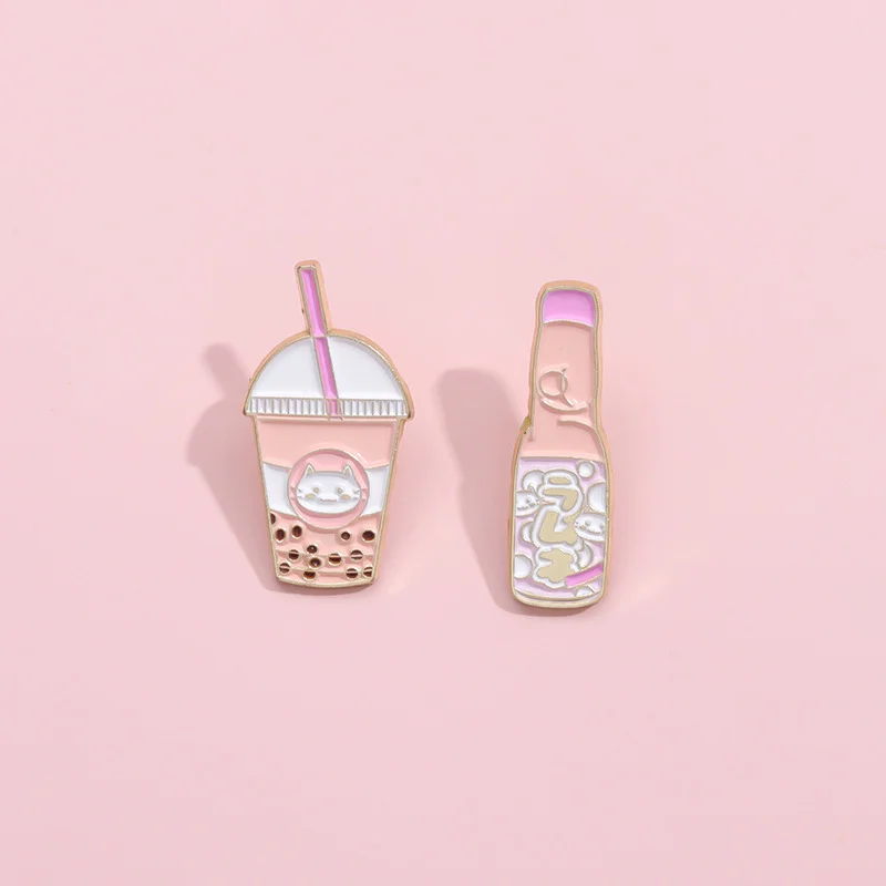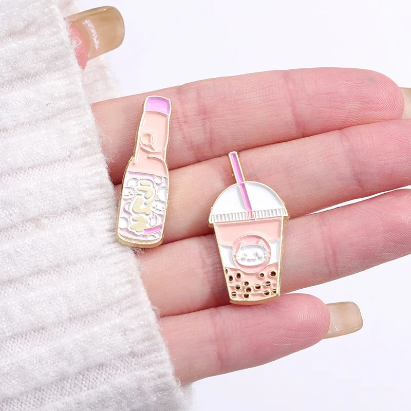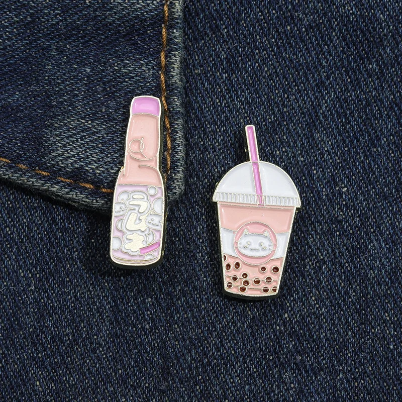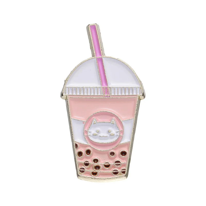 Cute Food Pearl Milk Tea Brooch Pink Drink Cat Straw Girly Scarf Buckle Milk Animal Metal Badge