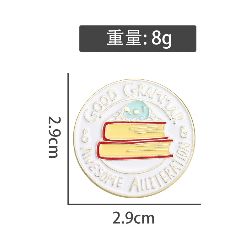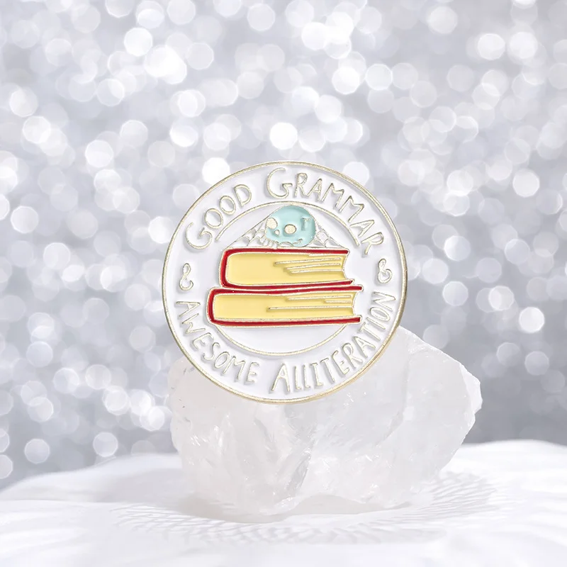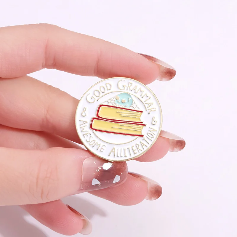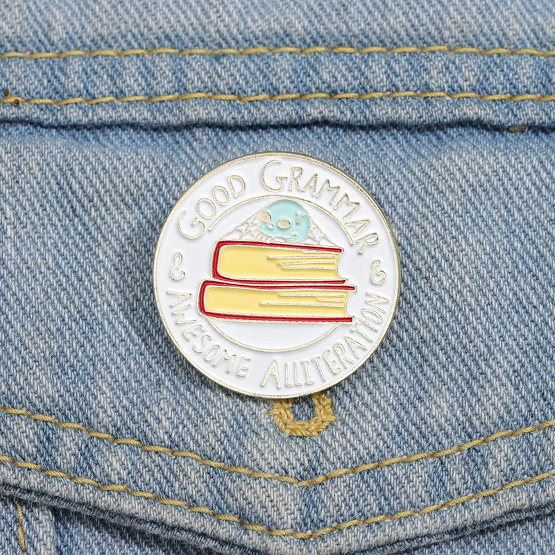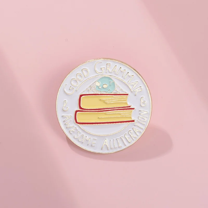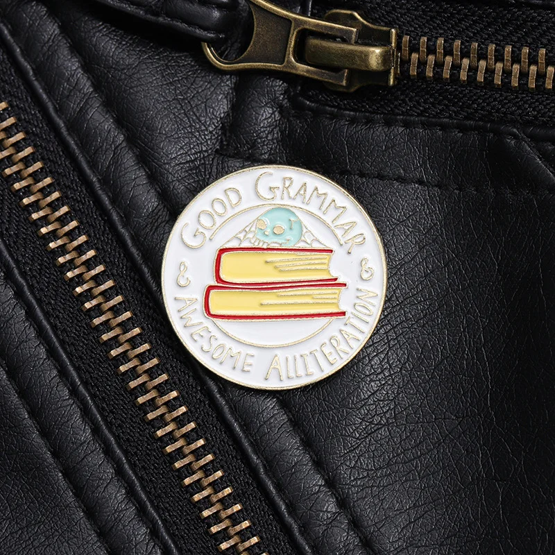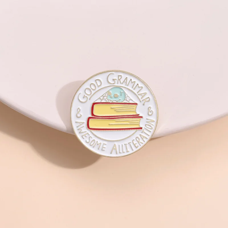 GOOD GRAMMAR AWESOME ALLITERATION White Round Enamel Pin Brooch Skull Book Knowledge Metal Badge Clothing Accessories Collar Pin Corsage Silk Scarf