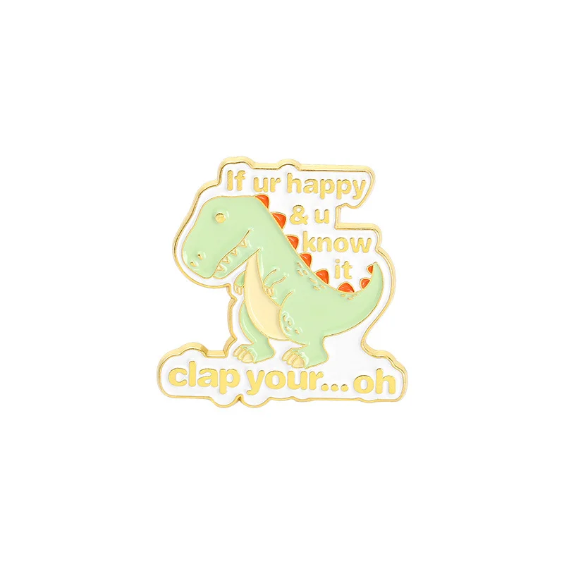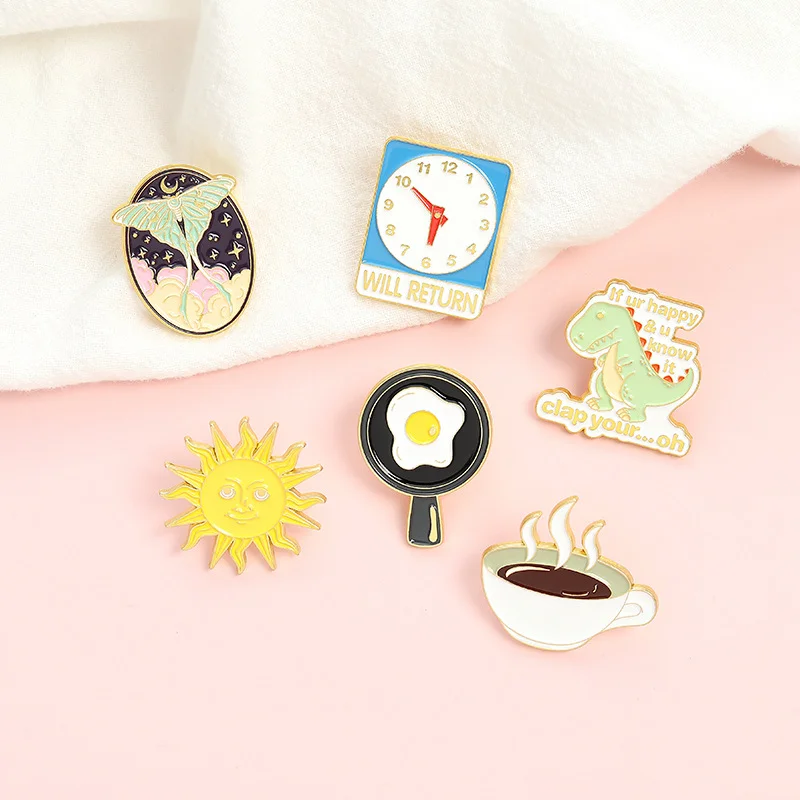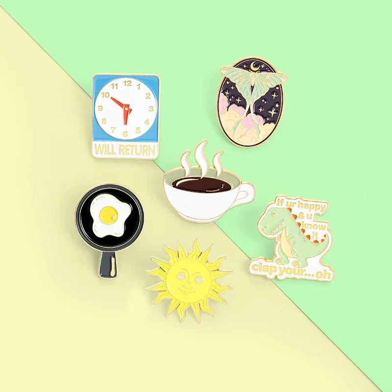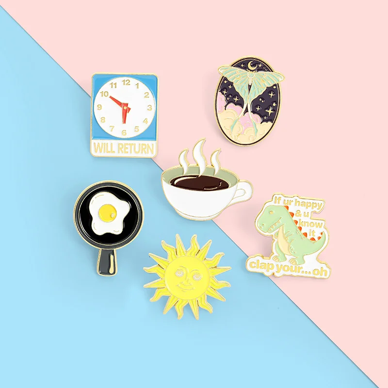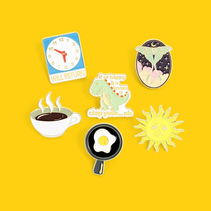 AliExpress New Products Creative Cartoon Alarm Clock Fried Egg Coffee Dinosaur Shape Paint Alloy Brooch Wholesale