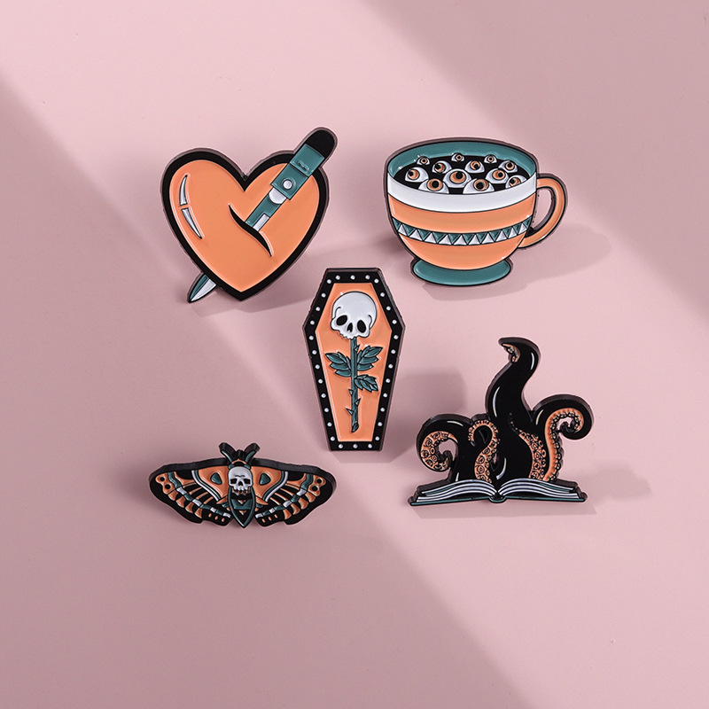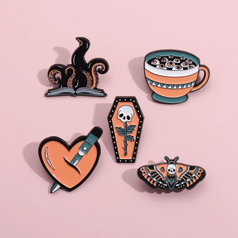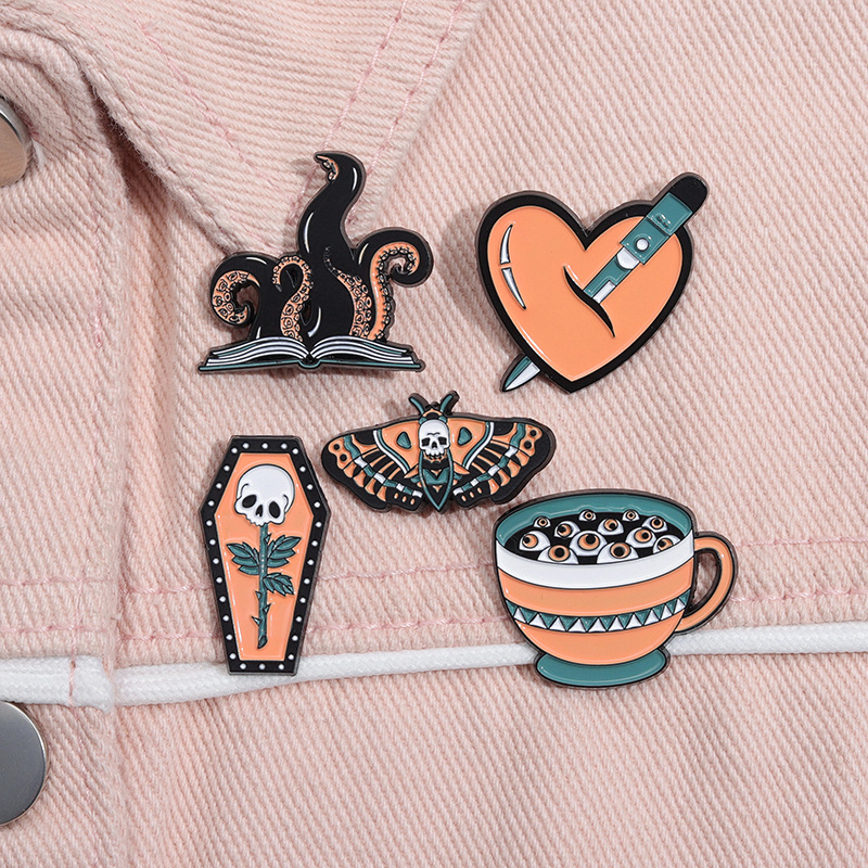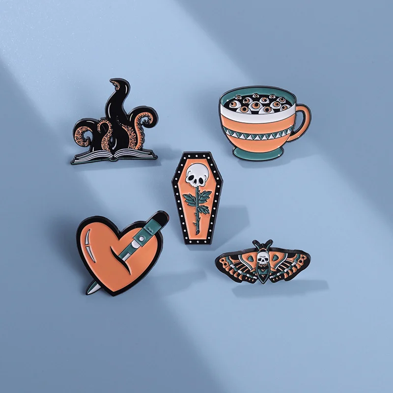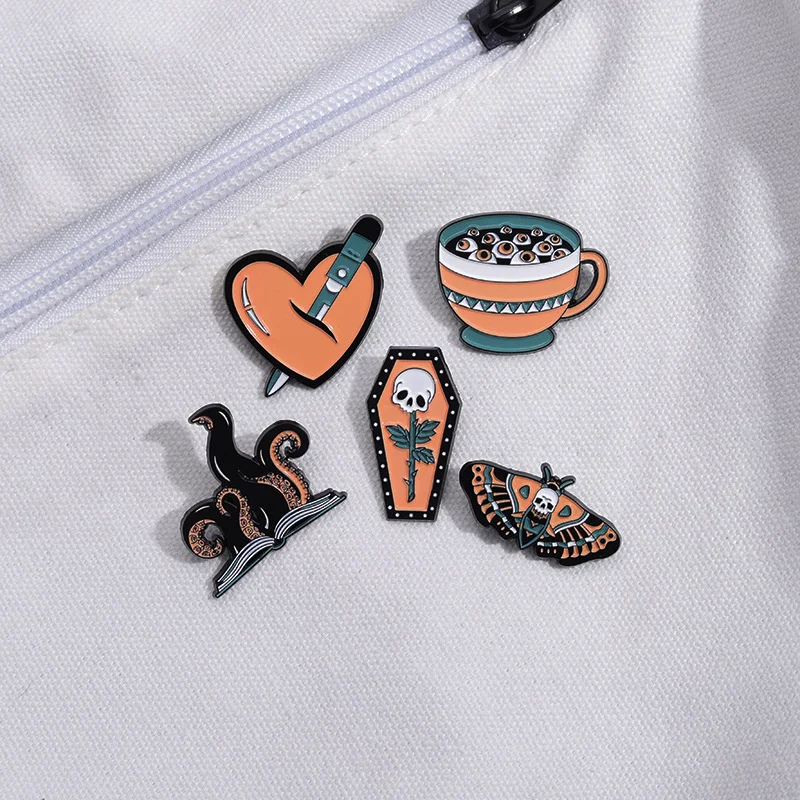 Animal Enamel Brooch Eyes Cup Love Dagger Skull Coffin Moth Octopus Reading Metal Badge Punk Costume Accessories Halloween Gift
