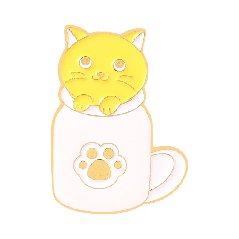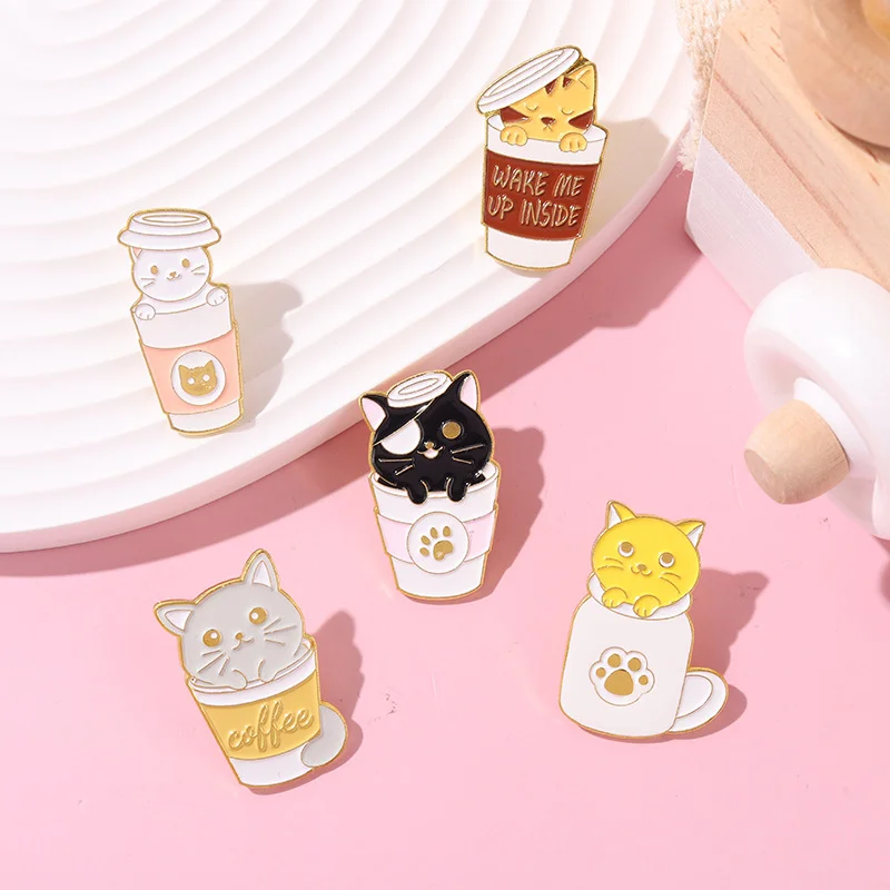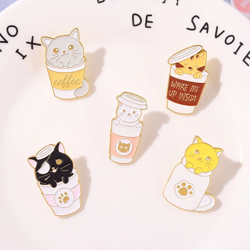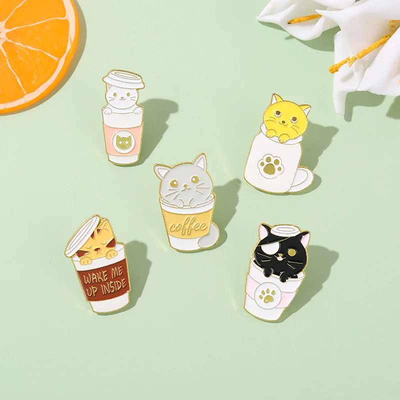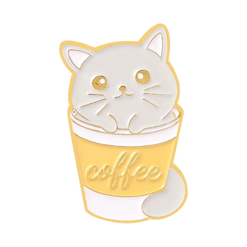 Custom Personalized Milk Coffee Cup Creative Lapel Pin Cartoon Cute Cat Hide and Seek Alloy Paint Clothing Accessories Brooch for Friends Wholesale