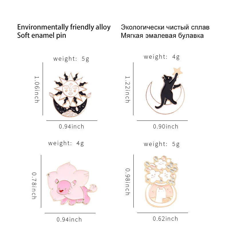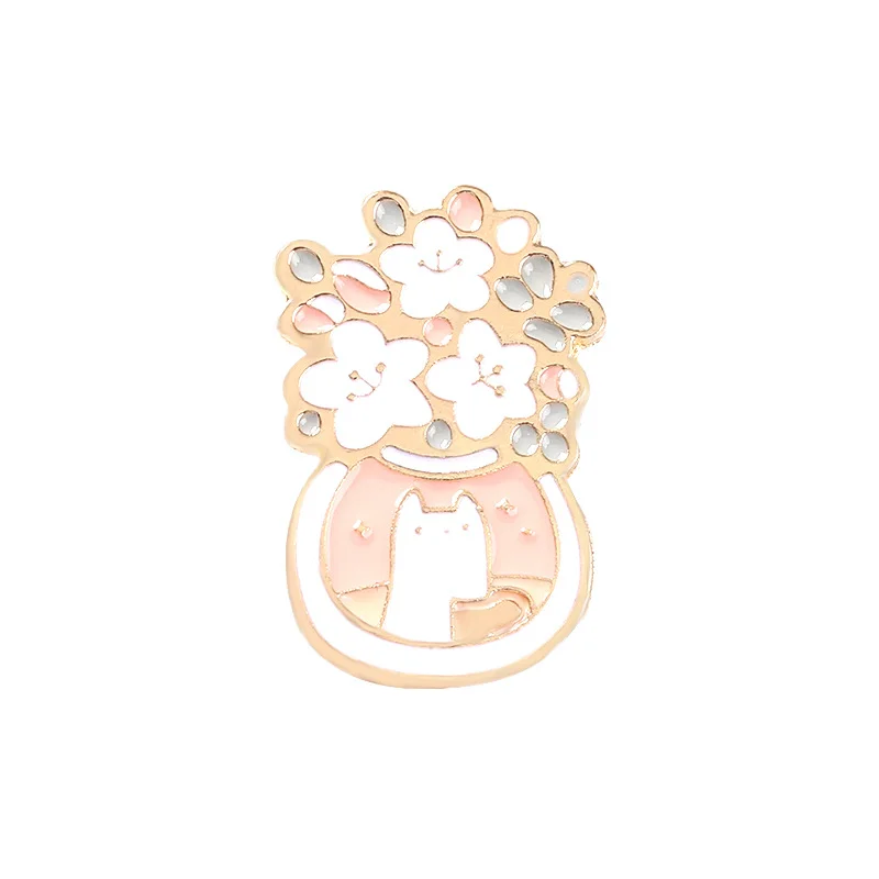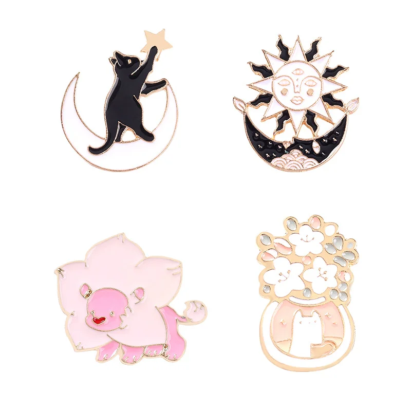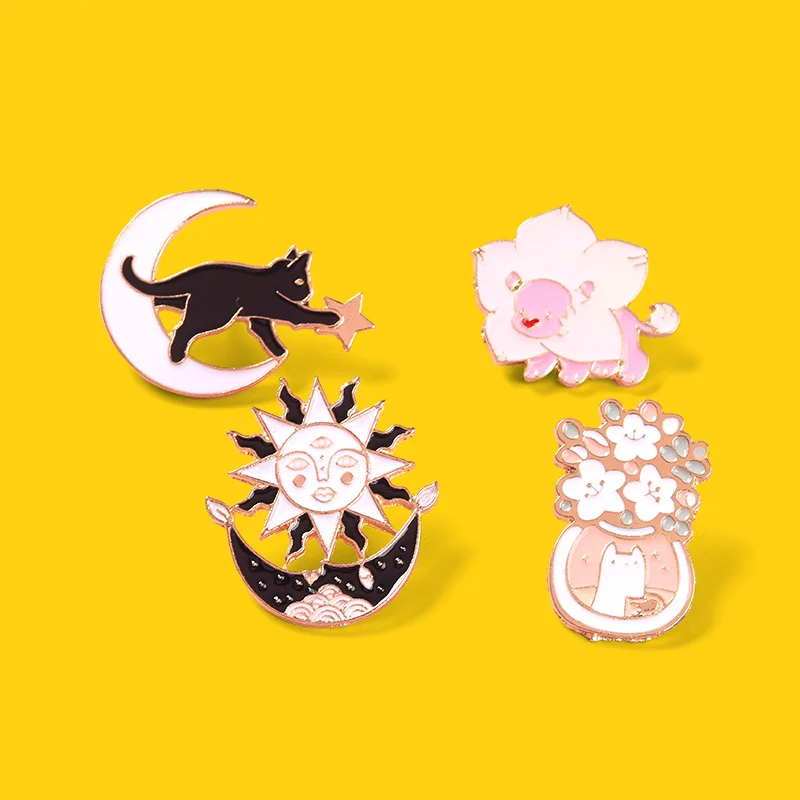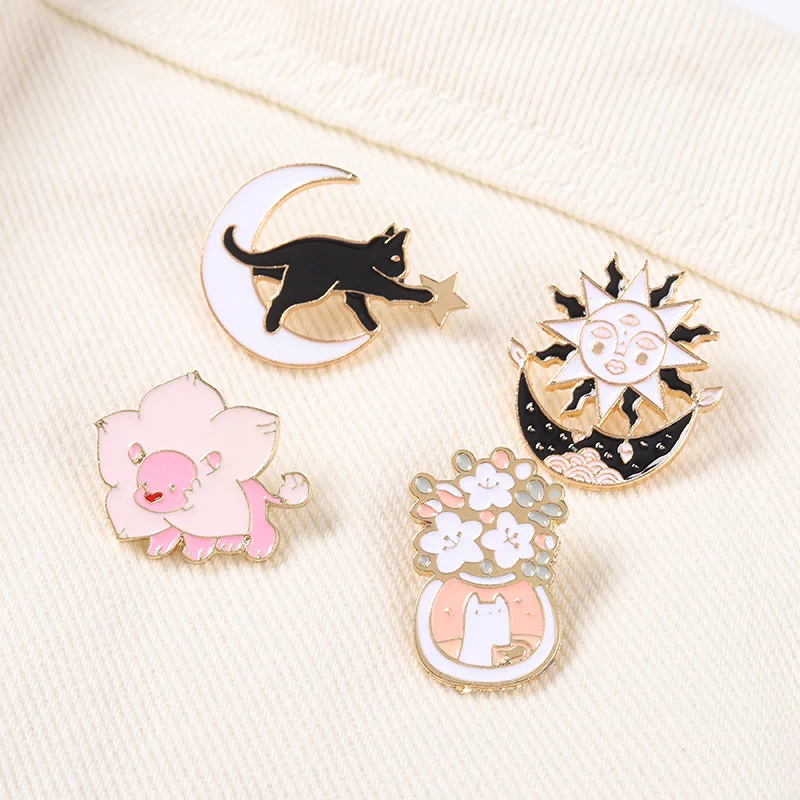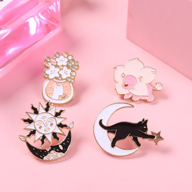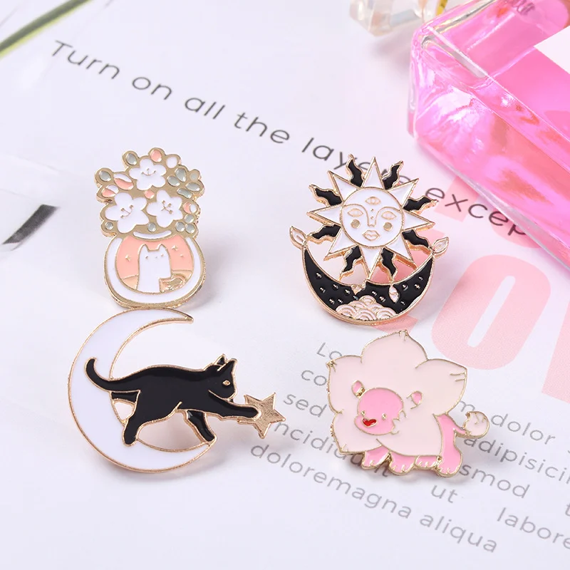 Cute Animal Brooch Pink Lion Moon Black Cat Vase Sun Metal Badge Pin Brooch Silk Scarf Buckle Small Accessories