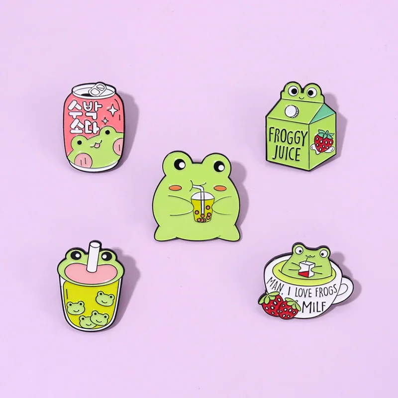 Green Cute Soda Bottle Milk Tea Strawberry Cartoon Frog Animal Shape Badge Soda Can Drink Bottle Milk Enamel Pin Corsage Accessories