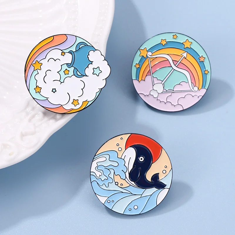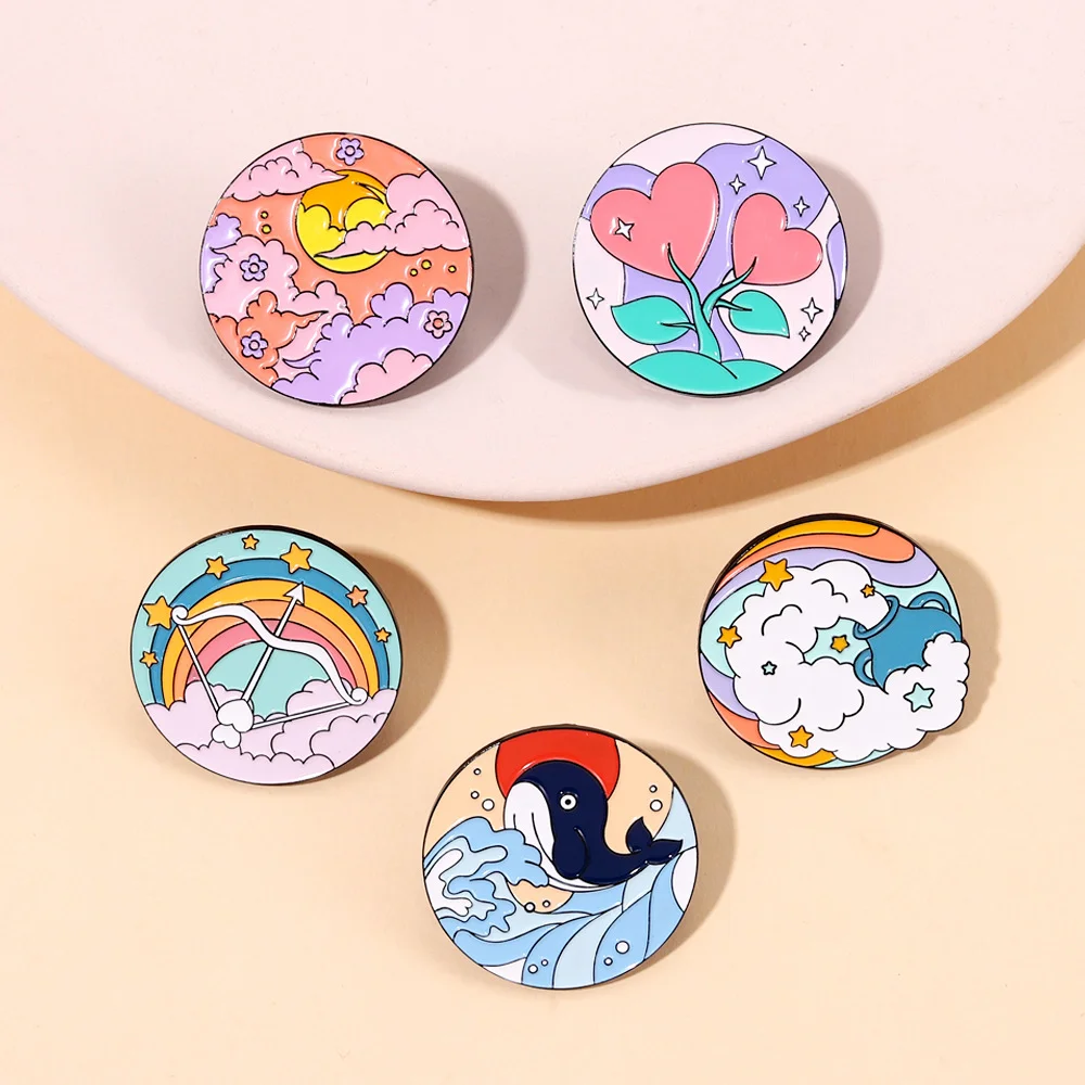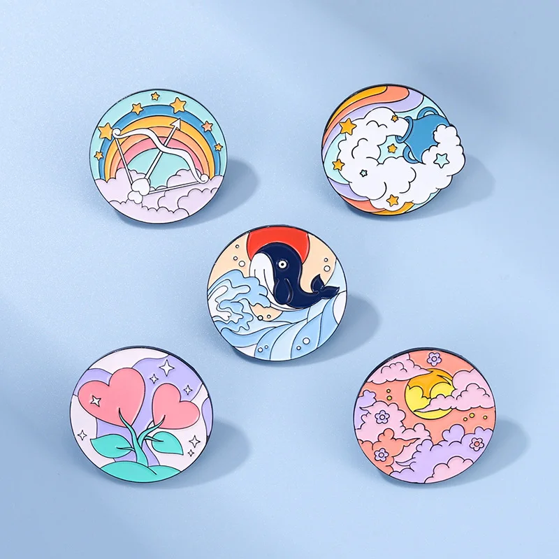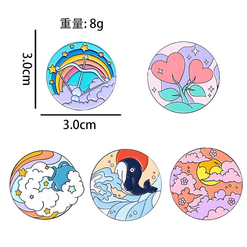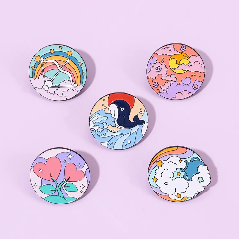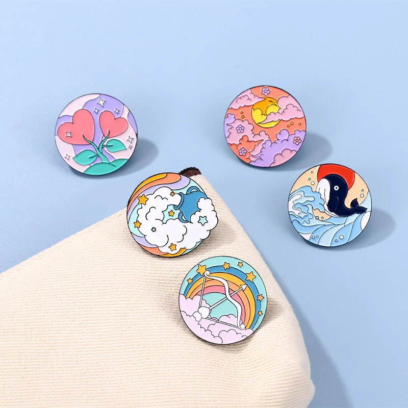 Bow and Arrow Scenery Round Sky White Cloud Rainbow Sea Wave Dolphin Whale Animal Flower Enamel Brooch Bag Decoration Badge