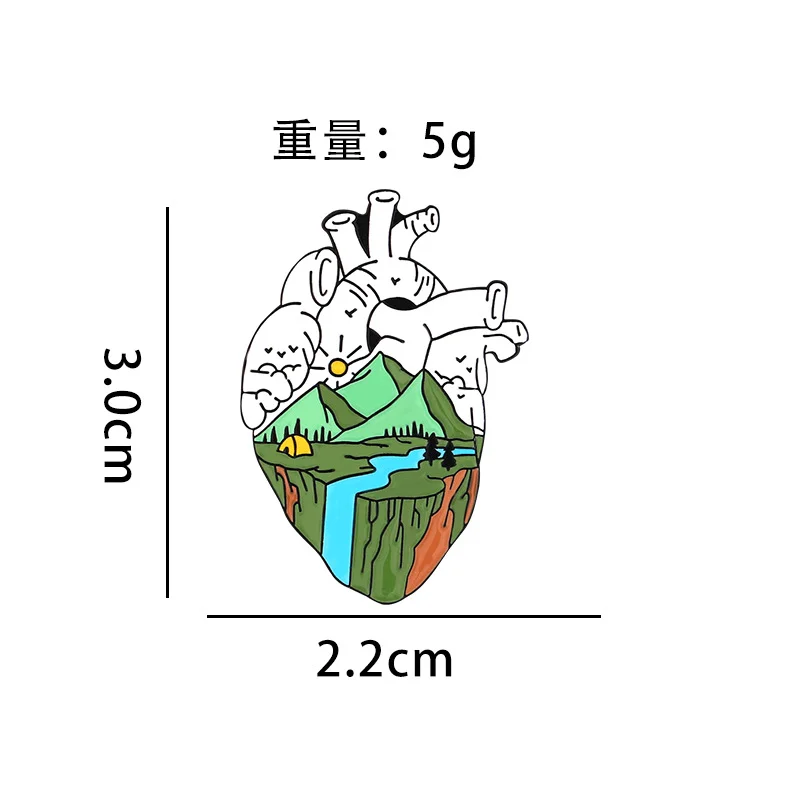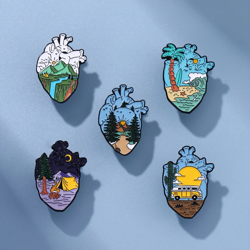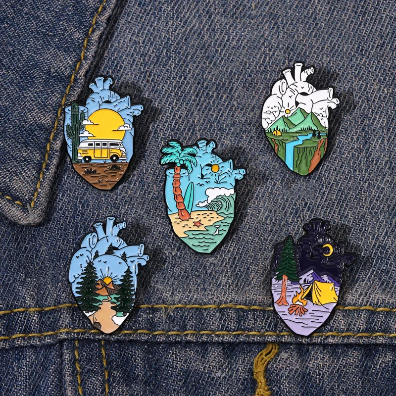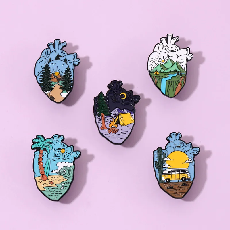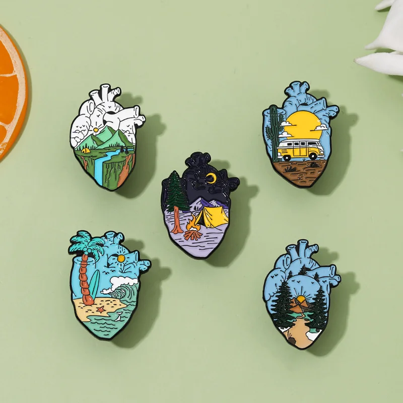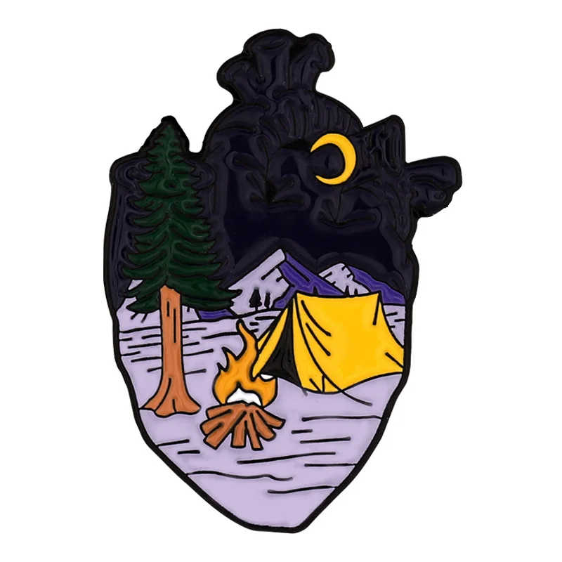 Outdoor Heart Travel Scenery Mountains, Rivers and Lakes Map Enamel Brooch Tent Surf Campfire RV Clothes Bag Decoration Badge
