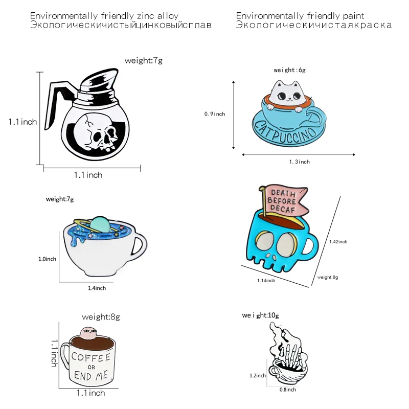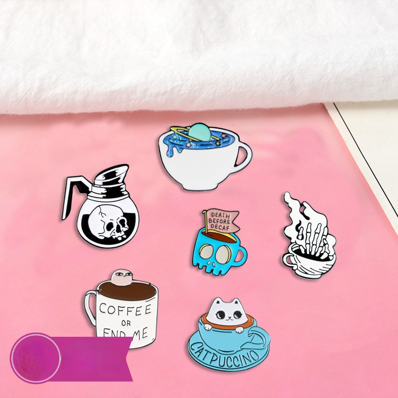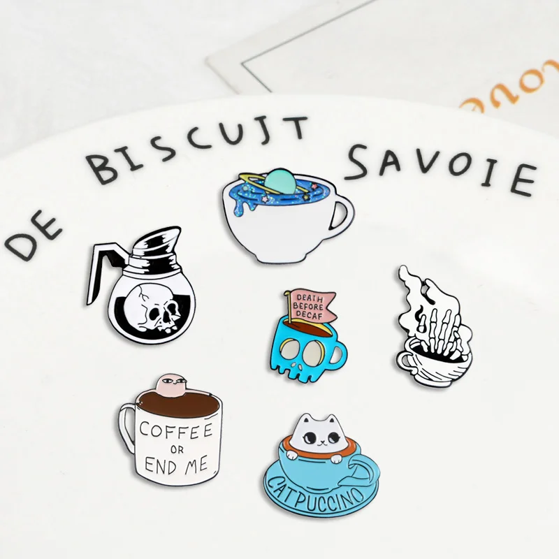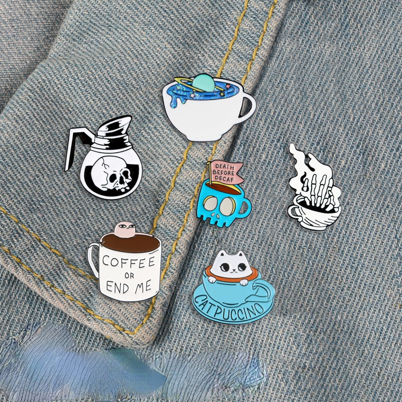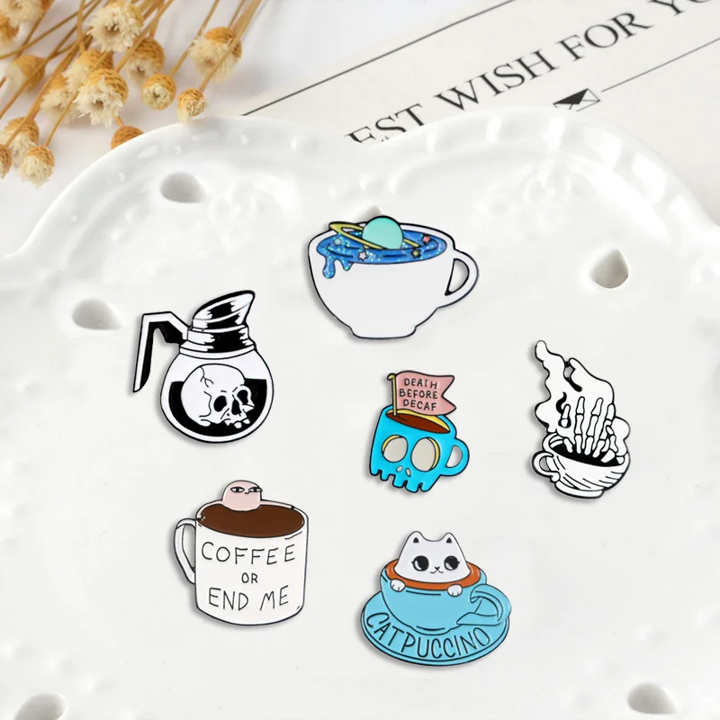 Cup and Coffee Skull Stars Cat Combination Denim Enamel Lapel Pins Collection Badges Brooches Gifts for Friend Jewelry Wholesale