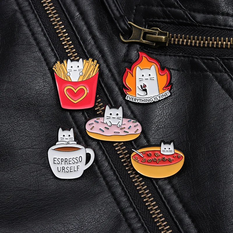 Cartoon White Cat Animal Brooch French Fries Donut Cute Cat Food Coffee Cup Noodles Enamel Pin Badge Versatile Clothing Lapel Pin