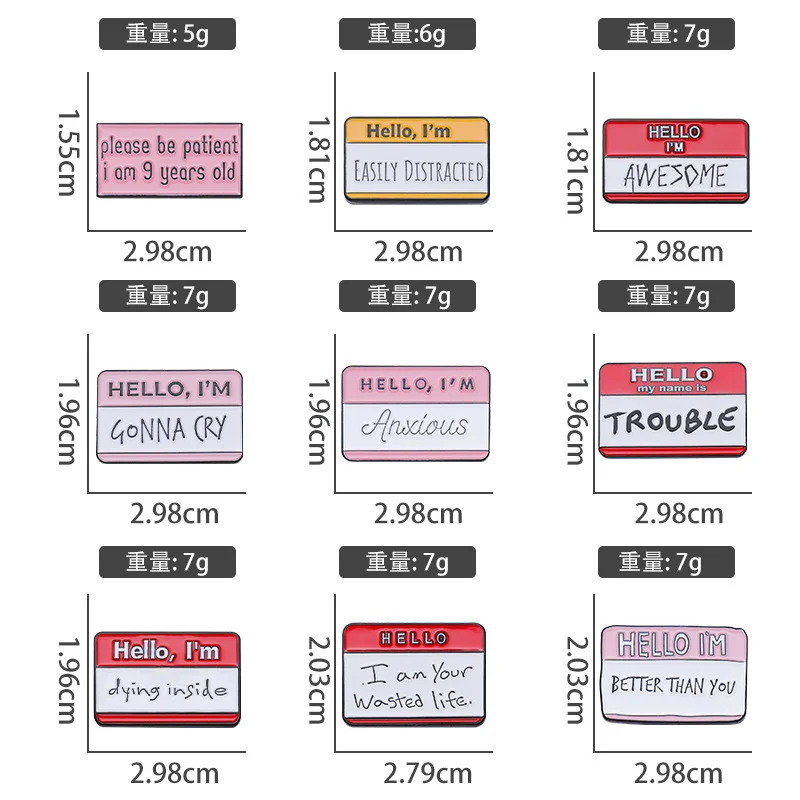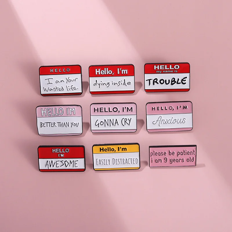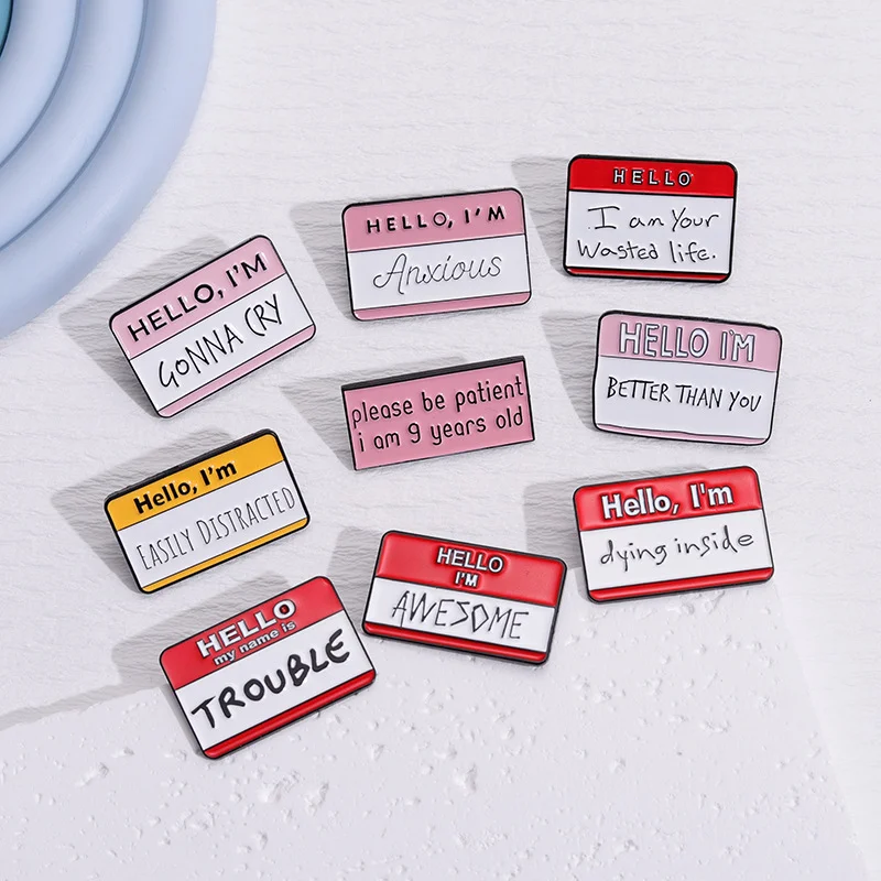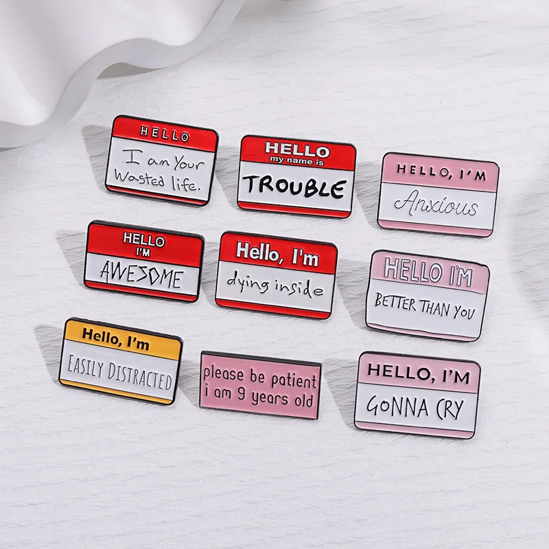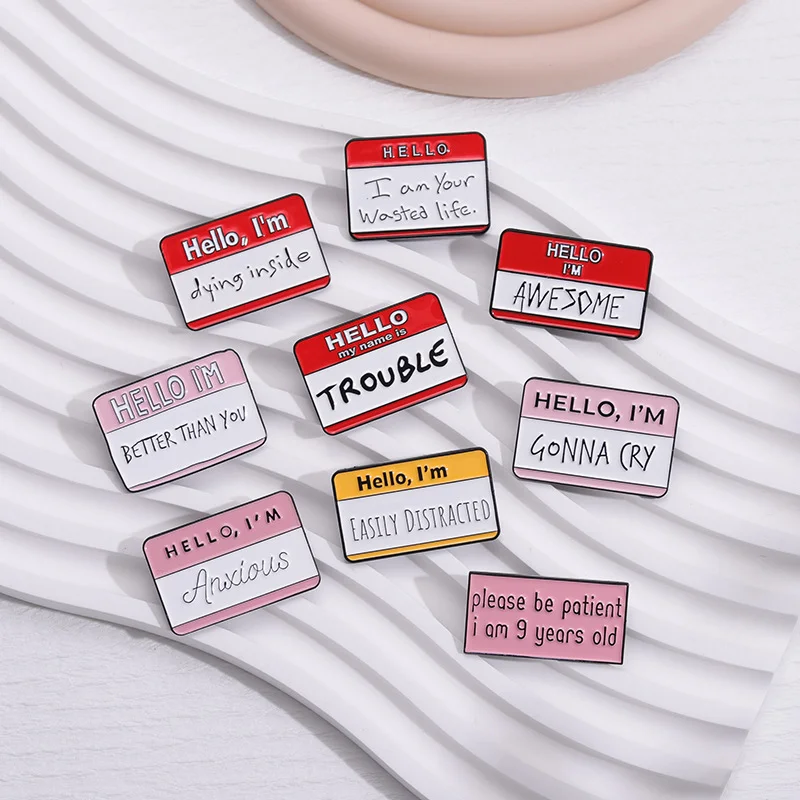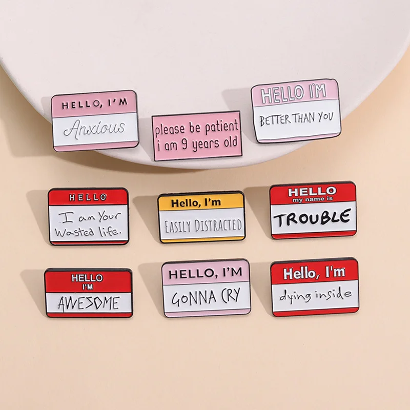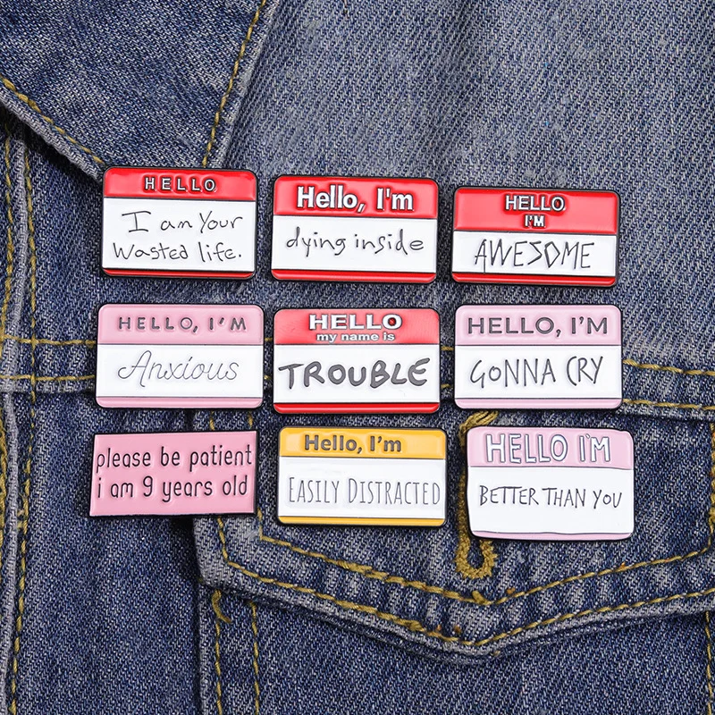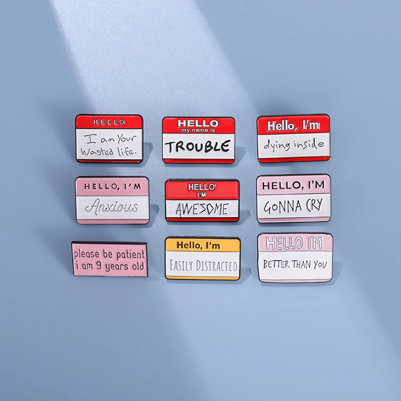 Geometric Rectangular Stamp Inspirational English Sentence Hello I'M Enamel Pin Metal Badge Text Creative Accessories Brooch Wholesale