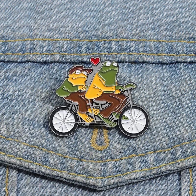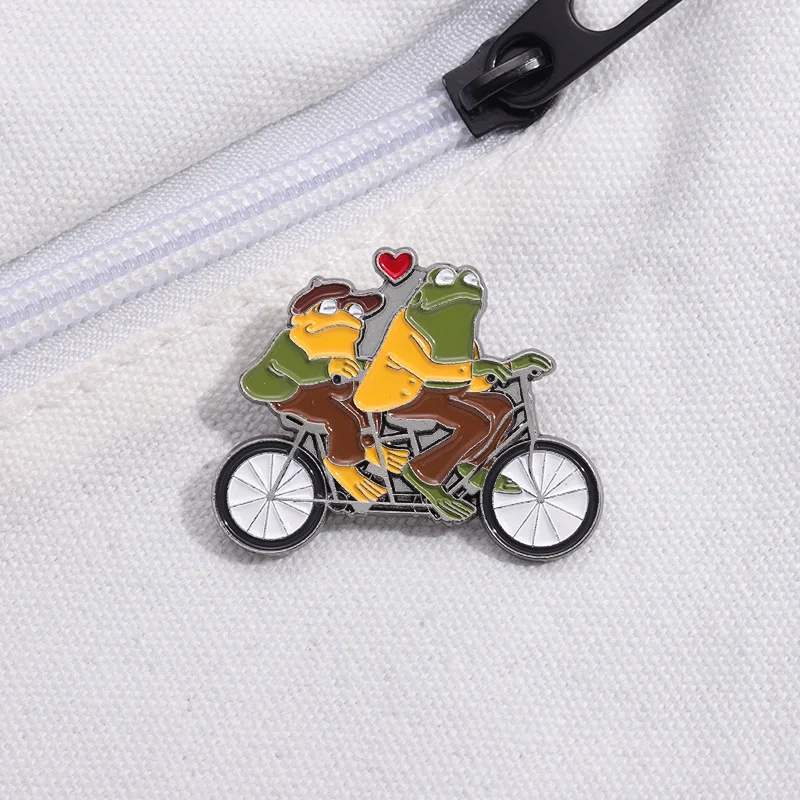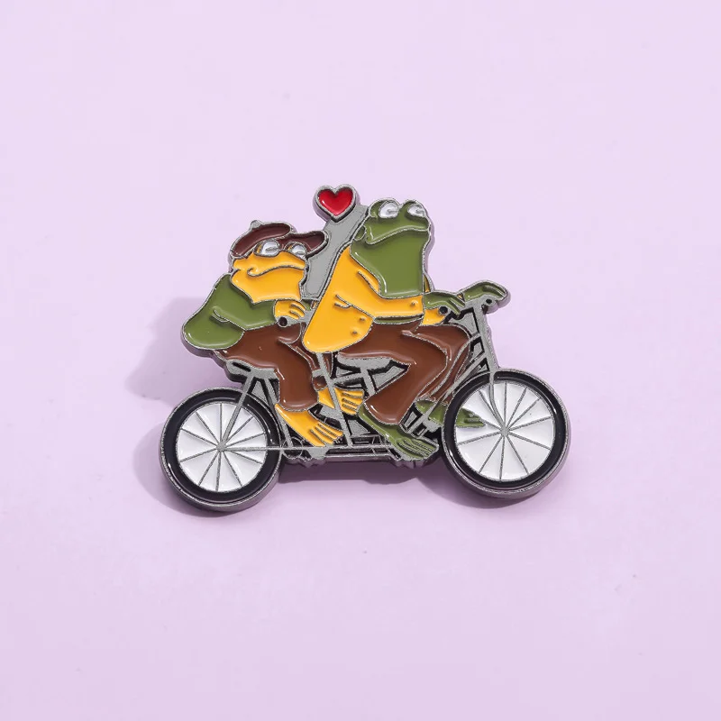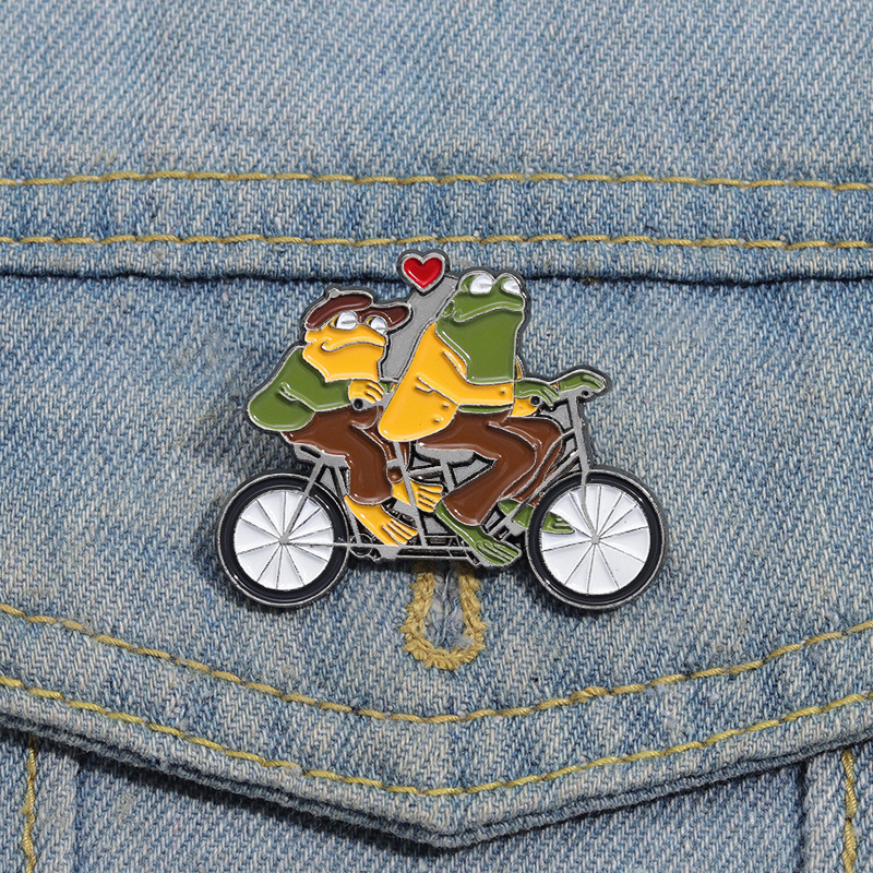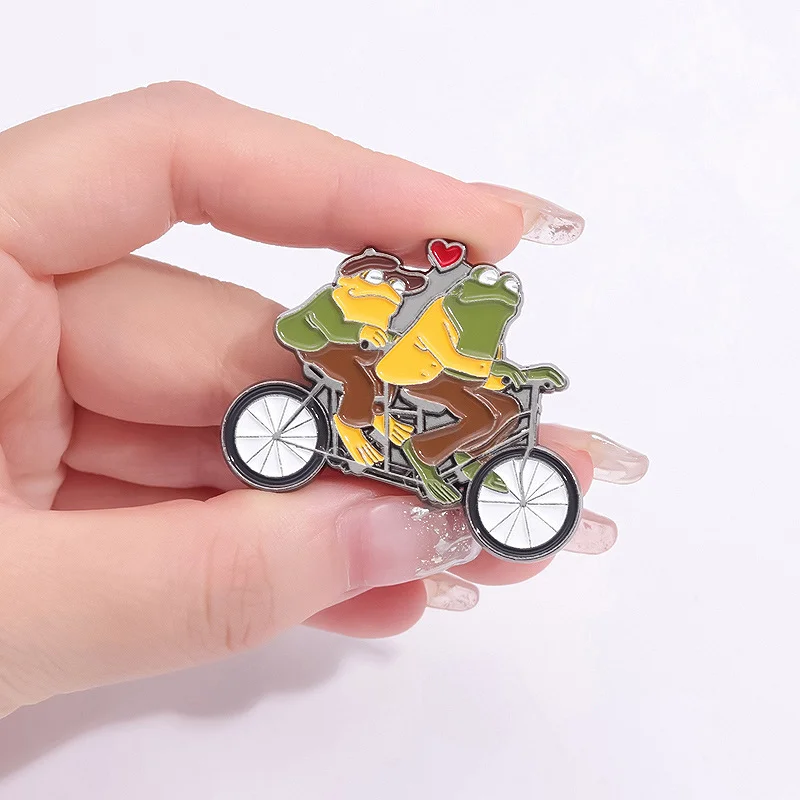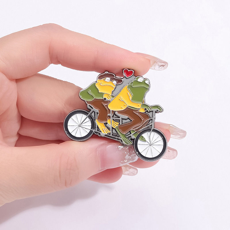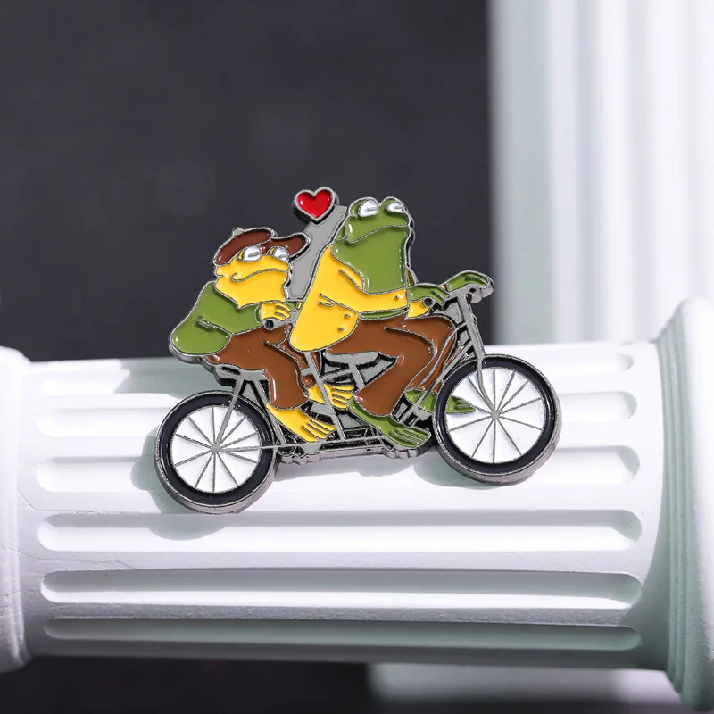 Funny Animal Frog Riding Bicycle Enamel Brooch Metal Brooch Creation Brothers Double Fun Corsage Badge Clothing Accessories